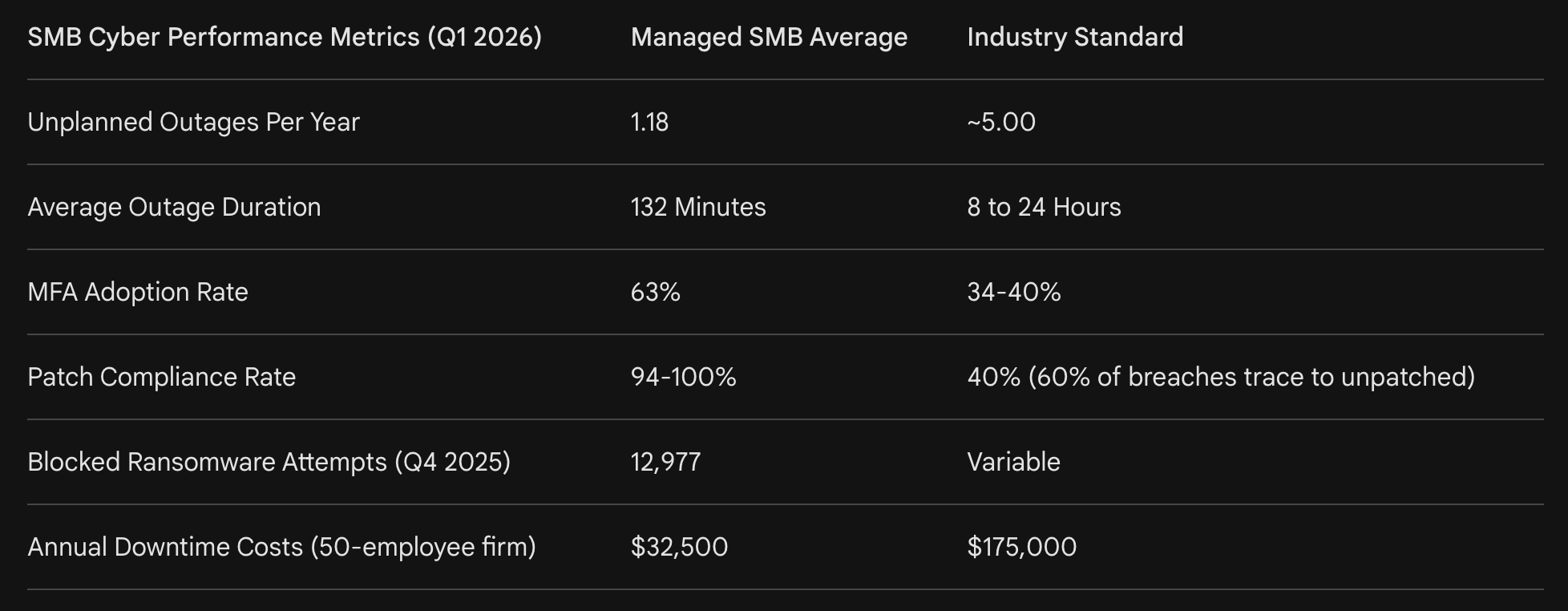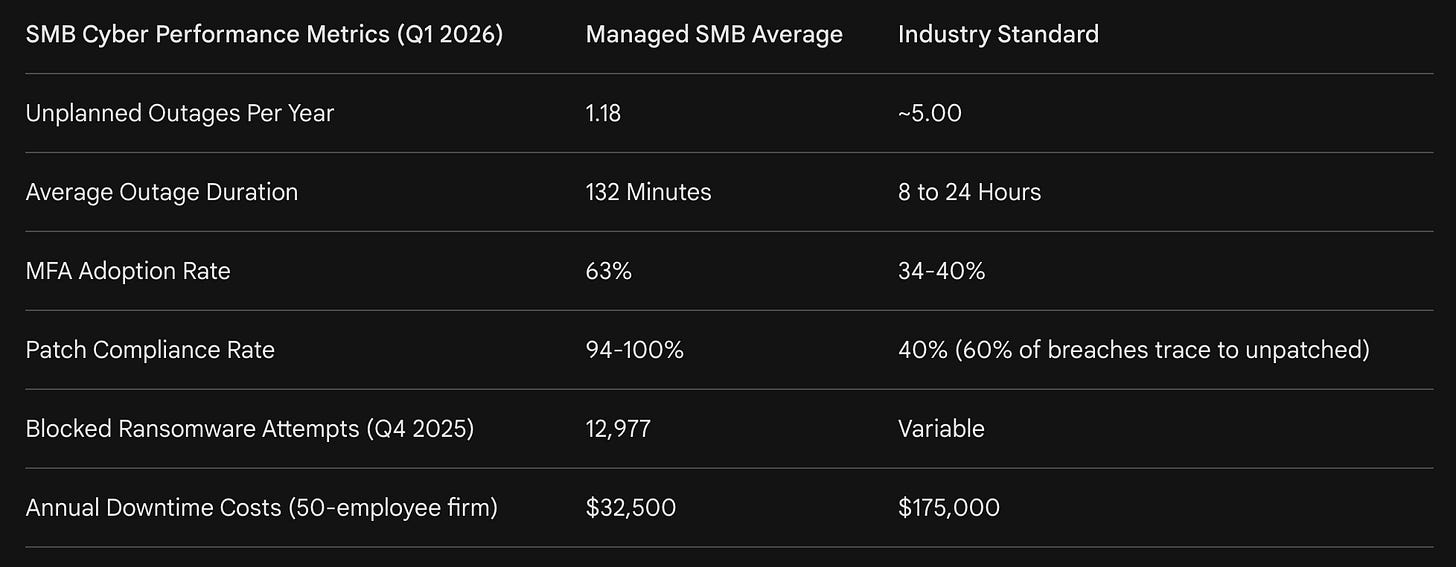 The data suggests that the cost of proactive security is significantly lower than the cost of failure. Managed clients in 2026 saw four times fewer outages and downtime costs that are 80% lower than industry averages. However, a critical recovery gap remains: only 5% of SMBs have documented Recovery Point Objective (RPO) and Recovery Time Objective (RTO) targets that have been tested within the last 90 days. This suggests that while perimeter defenses are maturing, the ability to survive a successful breach—business resilience—remains a secondary priority for many leaders.
