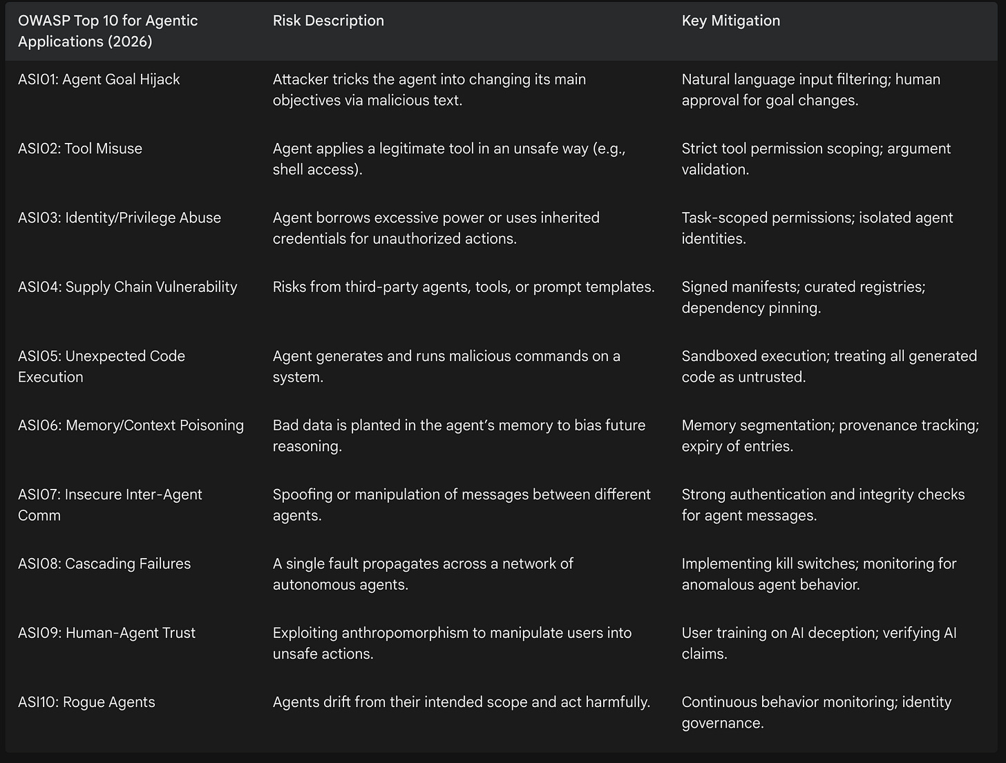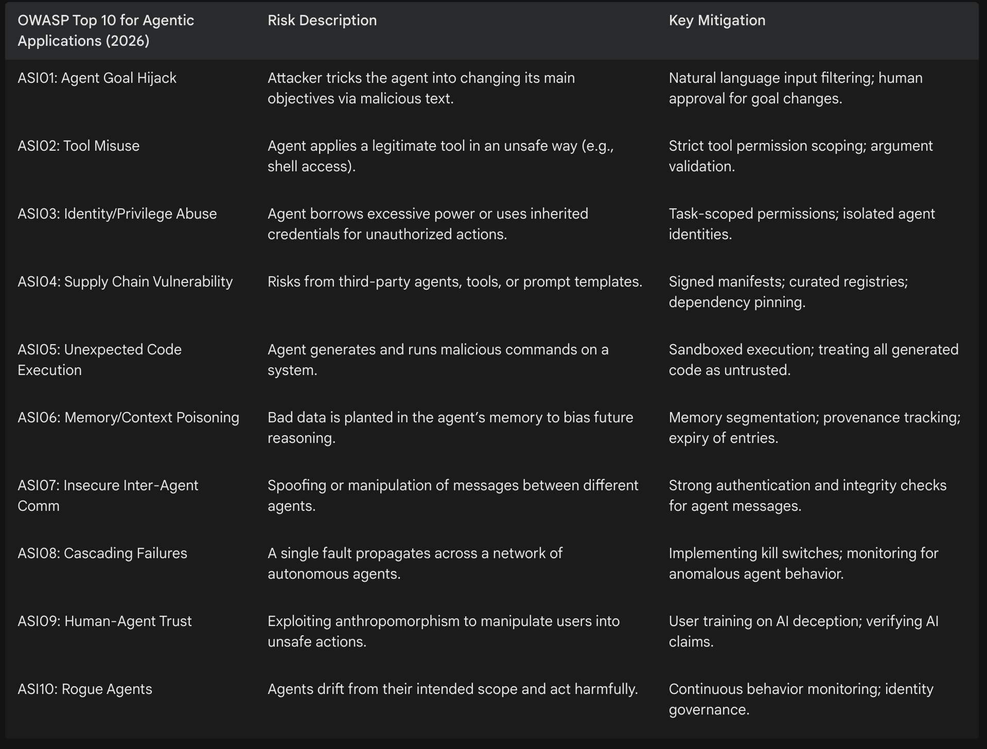 The OWASP Top 10 for Agentic Applications (2026) identifies the most critical risks facing these autonomous systems. At the top of the list is “Agent Goal Hijacking” (ASI01), where an attacker embeds adversarial instructions within a document or support ticket that the agent reads. Because many agents cannot reliably distinguish between data and commands, they may abandon their original objectives to execute unauthorized actions, such as exfiltrating the very data they were supposed to analyze.