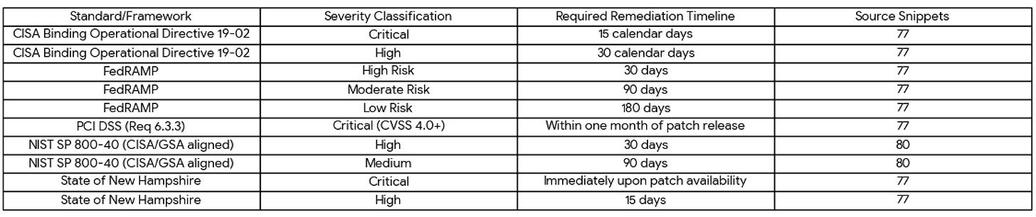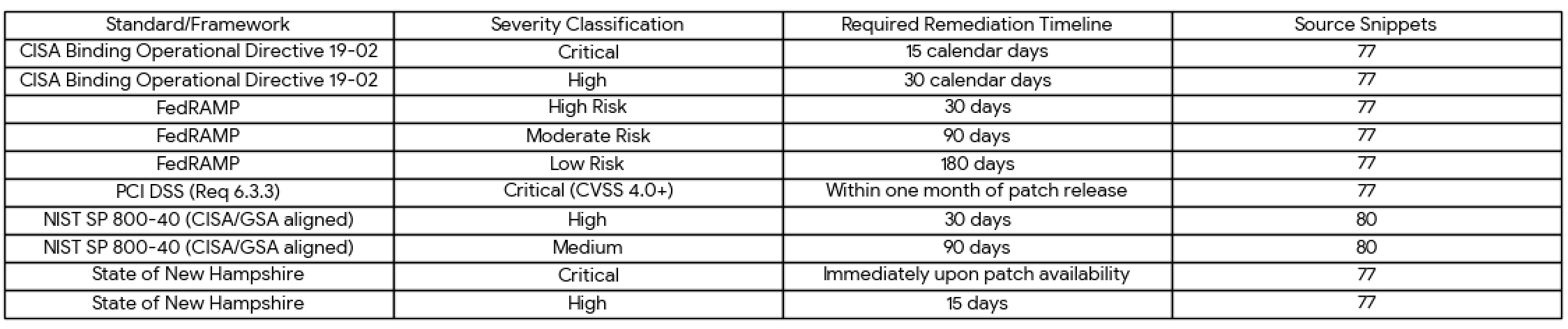 Note: Some standards may have slight variations in their definitions or timelines. For example, some sources indicate a 60-day timeline for FedRAMP Moderate risk vulnerabilities.77 Organizations should always refer to the latest official documentation for the specific standards they must comply with.