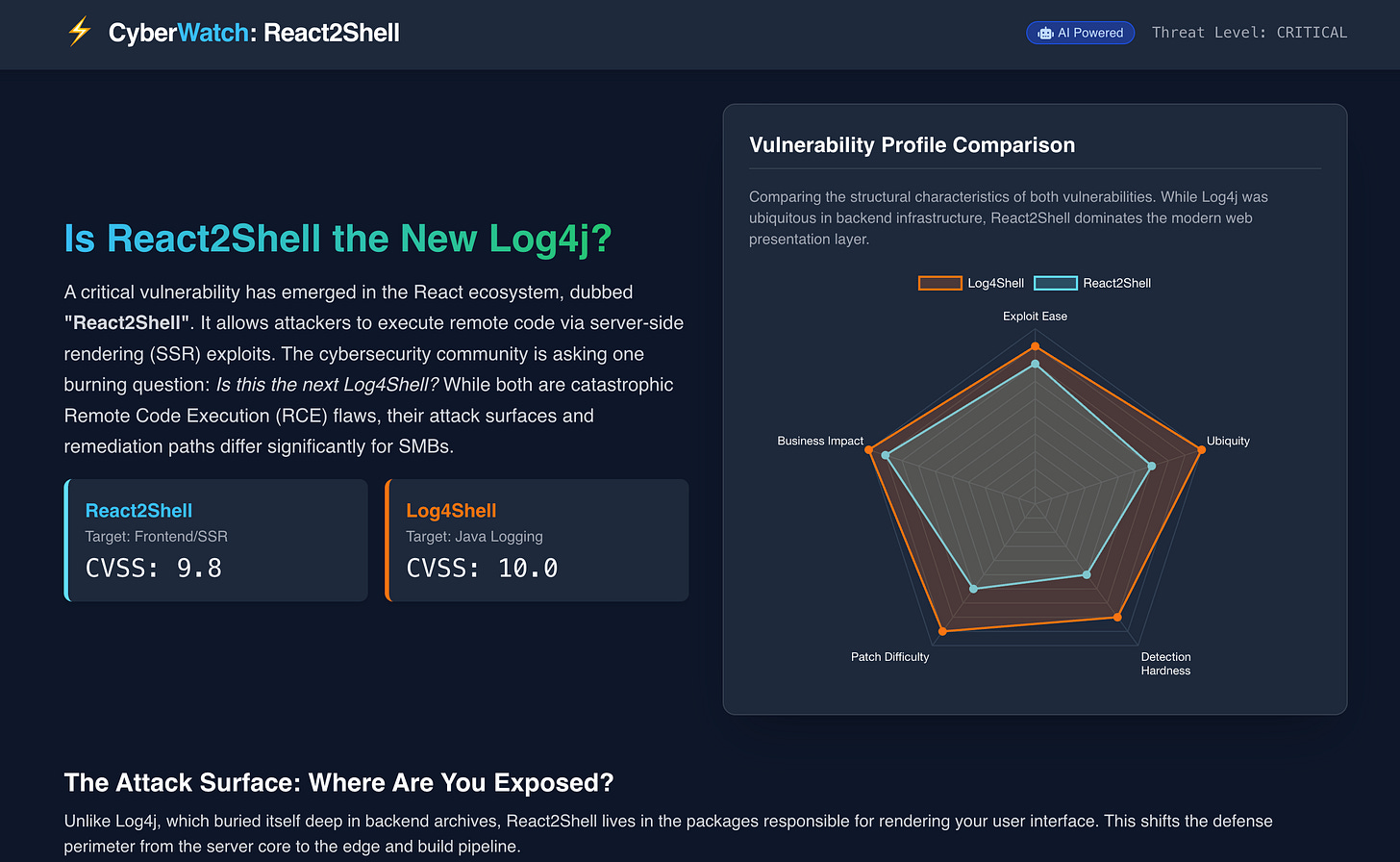 Technically: Yes. The severity, the unauthenticated RCE, and the supply-chain nature make it a peer to Log4Shell. Operationally: No. It lacks the universality of Log4j. It will not be found in your toaster, your elevator controller, or your 15-year-old ERP system. It is a “Web Ecosystem” crisis, not a “Global IT” crisis. However, for the SMB Tech sector—which disproportionately relies on Next.js for its speed and developer experience—the impact is functionally equivalent. If your business lives on the web, this is your Log4Shell.