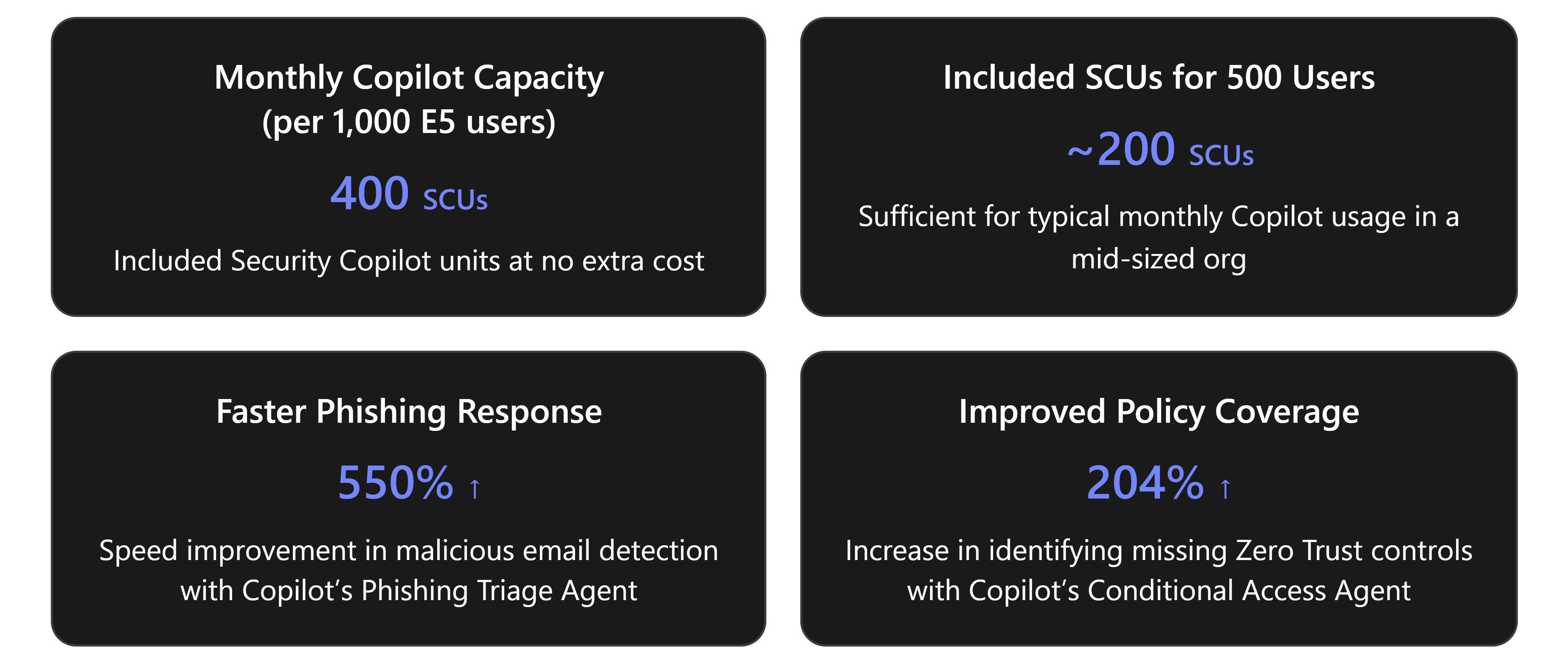 Leverage Included Capacity Wisely: The provided SCUs should comfortably handle routine Copilot usage, but it’s smart to prioritize high-impact scenarios. Focus on use cases that save the most time or significantly improve security outcomes. For example, using Copilot to auto-triage a flood of phishing emails can reduce dwell time from 30 minutes to just 5 minutes, and quickly summarizing a complex incident can cut processing time by over 80%. Such improvements yield more value than trivial queries. Luckily, typical SOC and IT workflows are well within the included 200 SCUs (for ~500 users) capacity. Microsoft’s example scenarios show that even dozens of Copilot prompts or in-depth analyses often consume just a few SCUs, so that the monthly pool goes a long way. (Tip: The Security Copilot portal includes a usage dashboard where you can monitor SCU consumption. Keep an eye on it initially to understand your usage patterns. Thus far, most organizations report they stay within the included allocation.) [learn.microsoft.com]