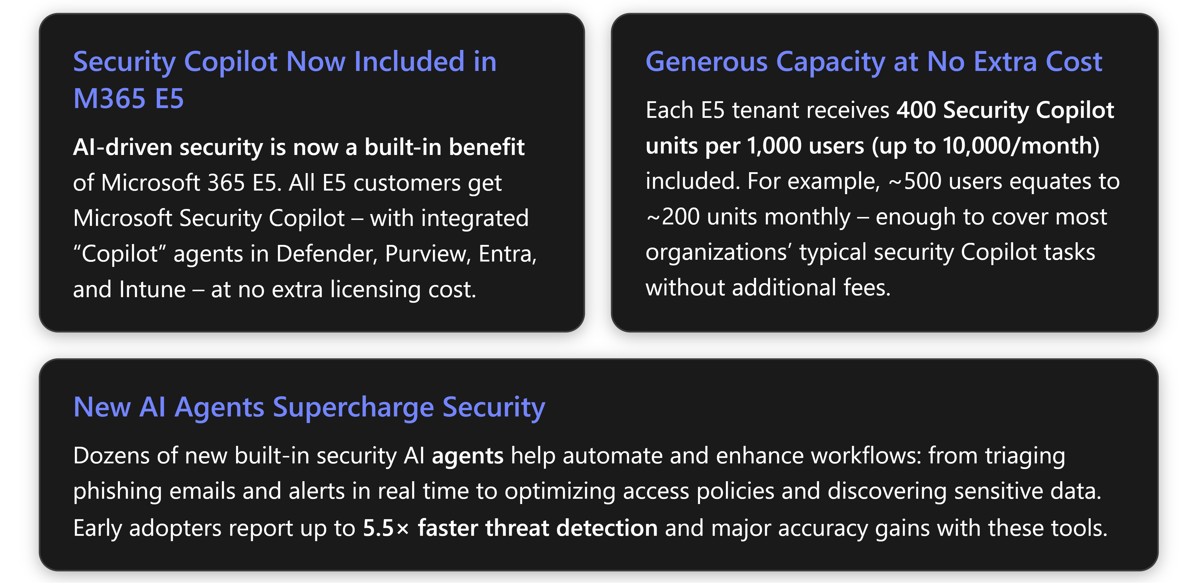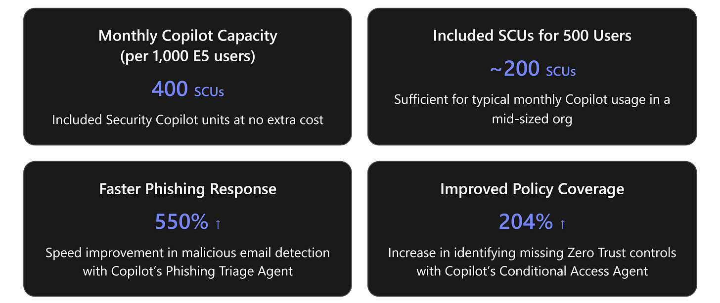 Cost/Value Analysis: From a cost perspective, the inclusion of Copilot in E5 is extremely compelling. If you already pay for M365 E5, you are essentially getting what was a high-end AI service for free. The SCU inclusion model means you’re not paying for idle time or capacity you don’t use; you get a pool of “AI hours” to draw from as needed, which is far more cost-effective than the old per-hour provisioning model. For example, under the prior model, a company might have paid for 5 SCUs/hour (~ five concurrent AI tasks) around the clock, incurring charges for unused time. Now, the company can consume the equivalent (e.g., 3.5 SCUs over 2 hours) from its monthly pool with no additional billing. The bottom line: if you have E5, there’s no financial barrier to using Security Copilot broadly. The value in improved security outcomes and efficiency should vastly outweigh any risk of hitting the included limits. In the rare case you do need more AI capacity, the marginal cost is incremental and controllable (e.g., budget an extra few hundred dollars for critical months). [learn.microsoft.com]