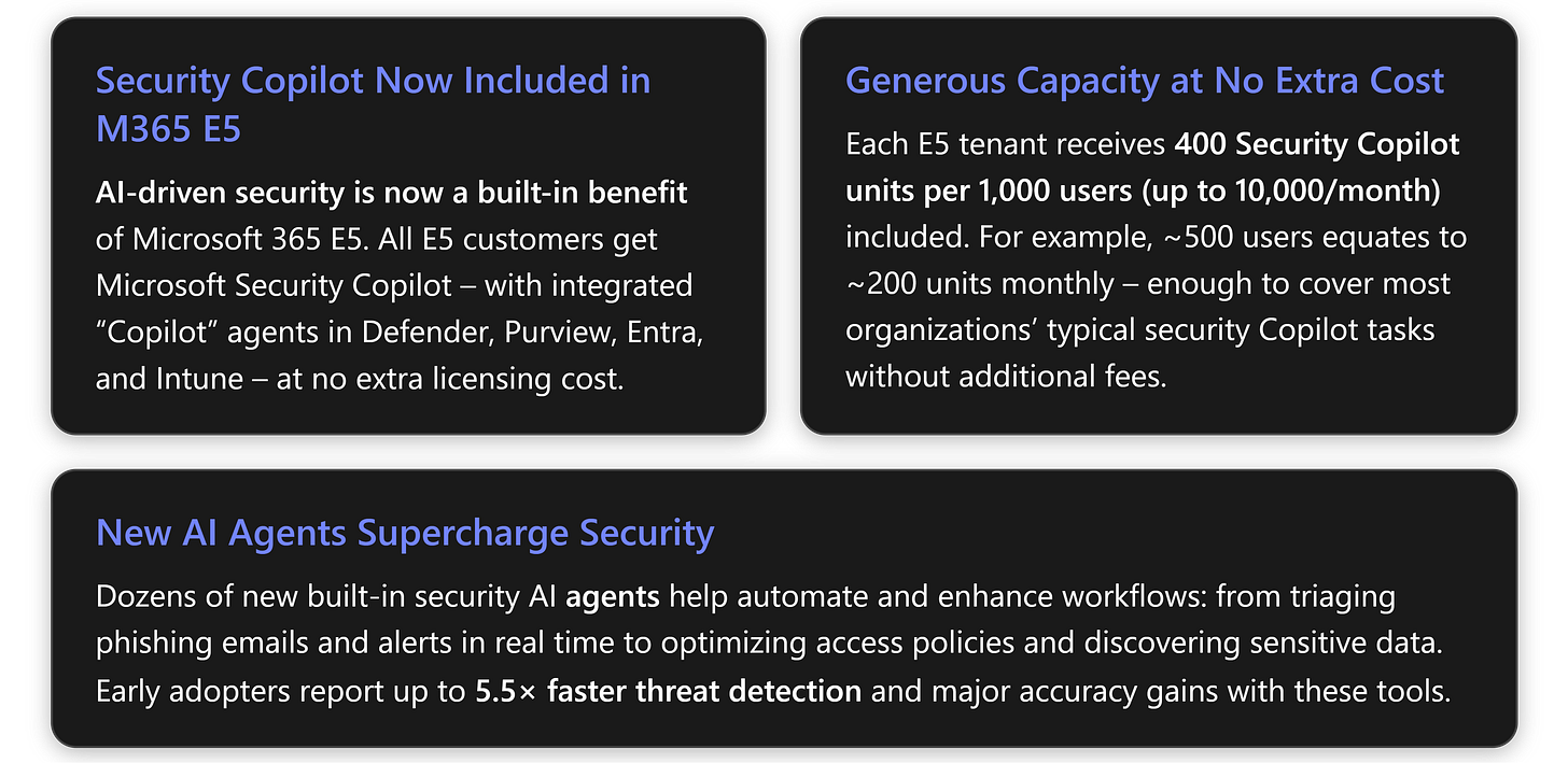Microsoft Security Copilot is an AI assistant that leverages generative AI and Microsoft’s vast threat intelligence to help security teams detect, investigate, and respond to threats faster. Previously, Security Copilot was a costly add-on service. Now, Microsoft has bundled Security Copilot into the M365 E5 subscription (including M365 E5 Security) as a core entitlement. This inclusion dramatically broadens access to advanced AI security capabilities for E5 customers. [robquickenden.blog]