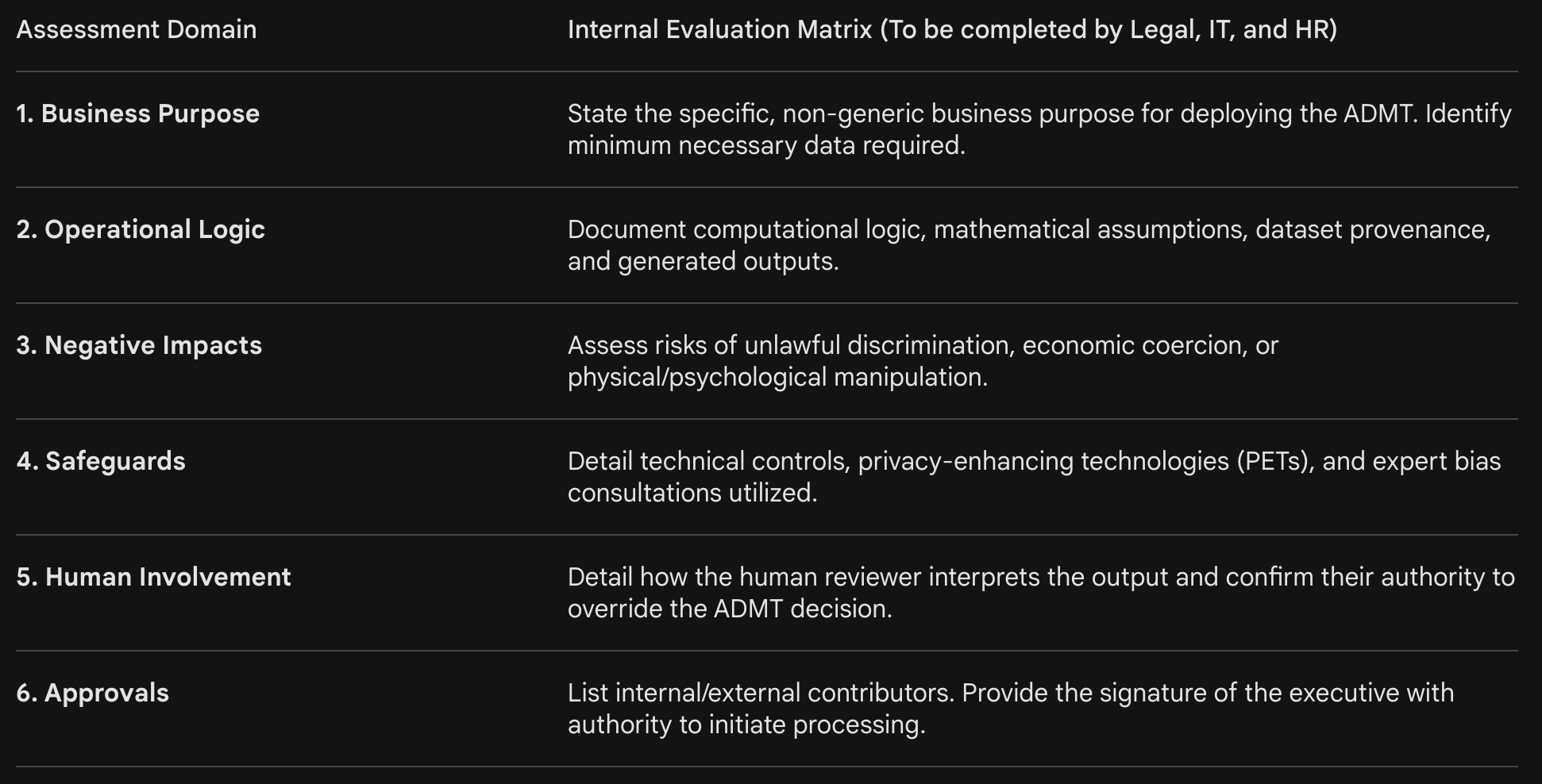 This framework ensures compliance with the documentation requirements outlined in the 2026 CPPA regulations for businesses deploying AI/ADMT.