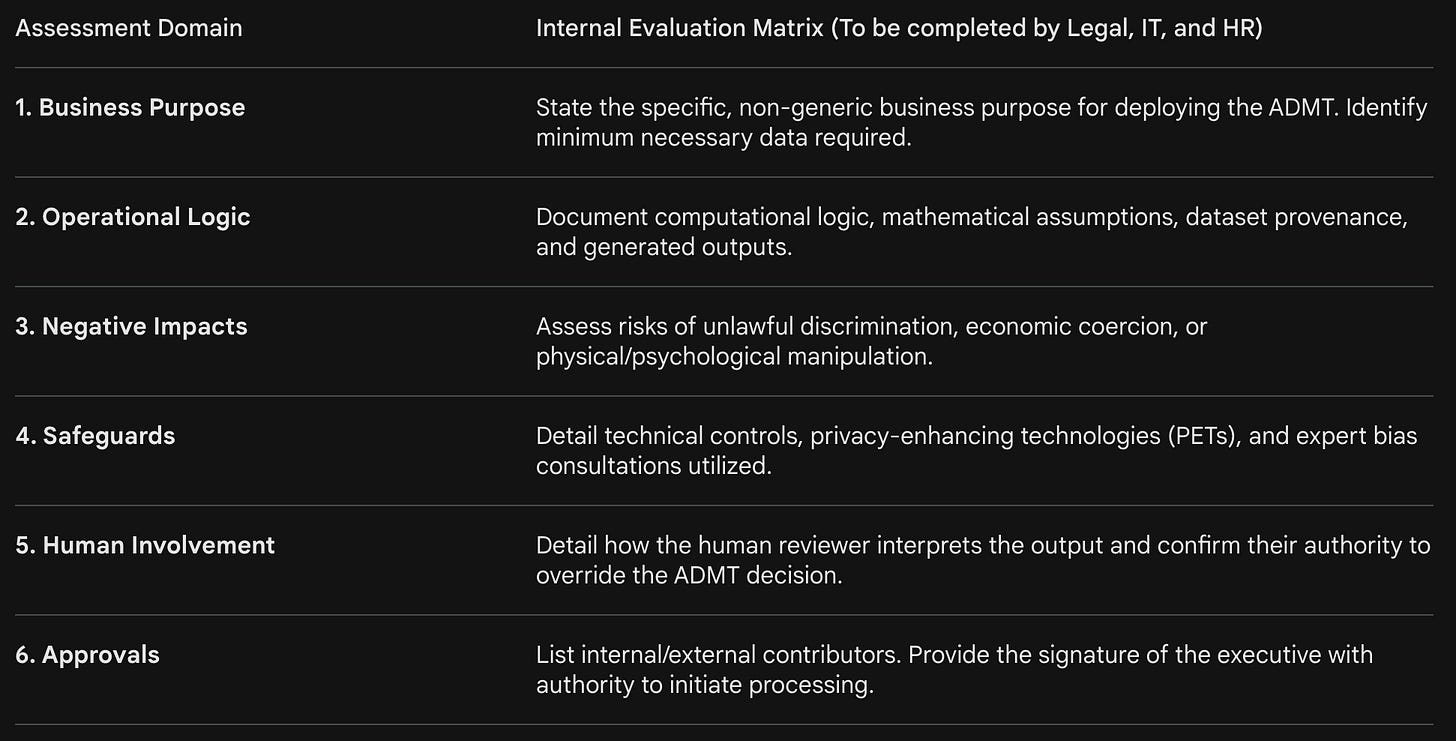 Execute Formal ADMT Risk Assessments: Immediately audit all internal systems and third-party Software-as-a-Service (SaaS) applications to identify any automated decision-making deployments and document the specific operational logic.